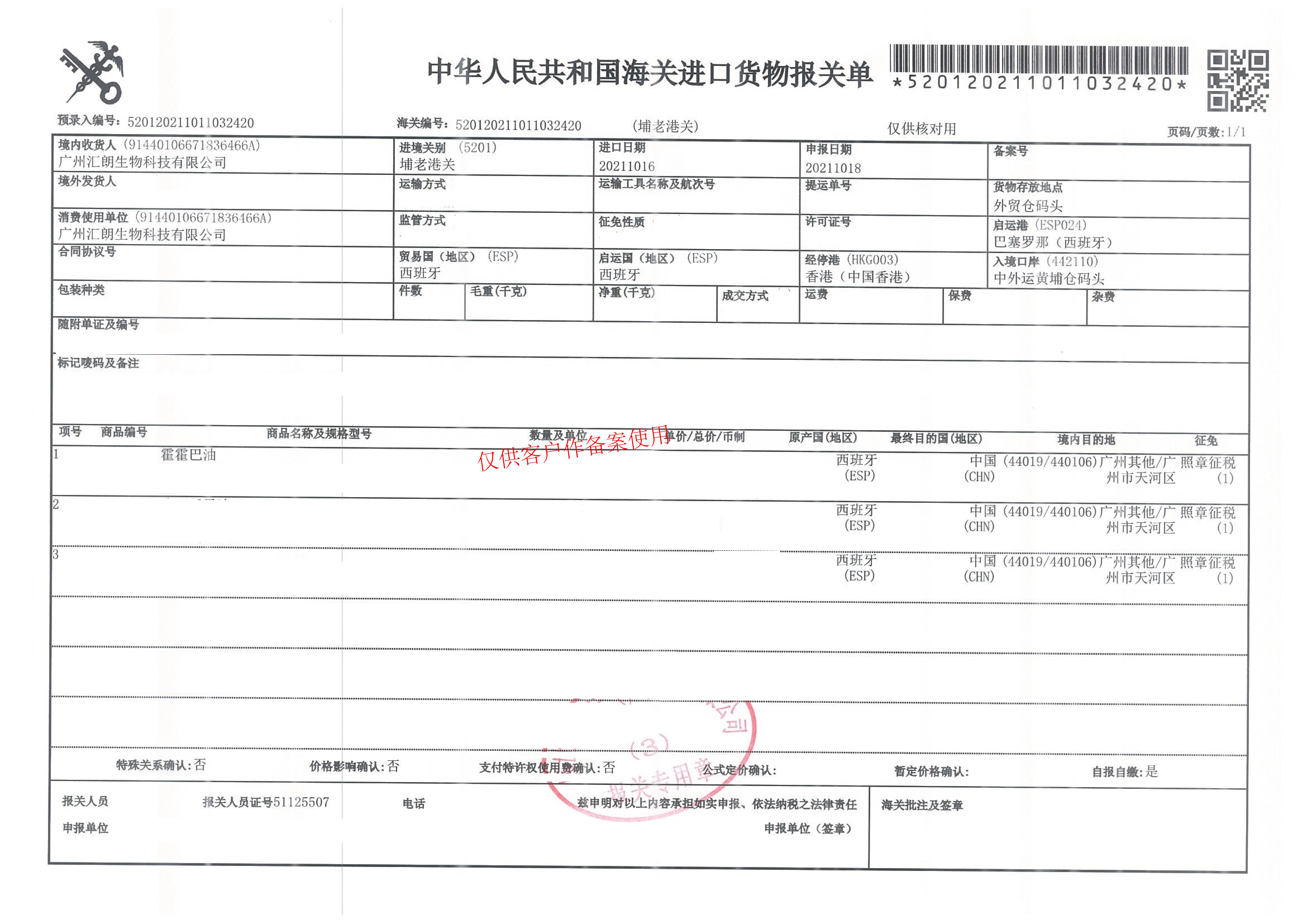 金色霍霍巴油报关单